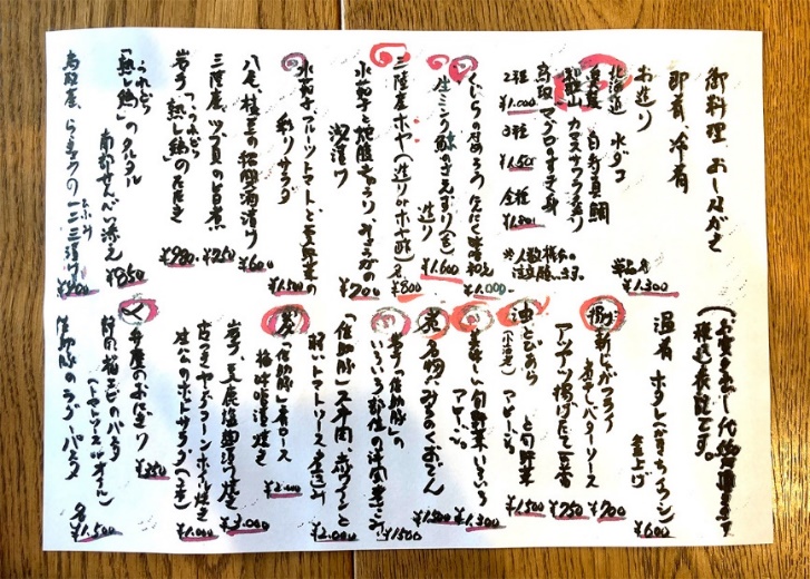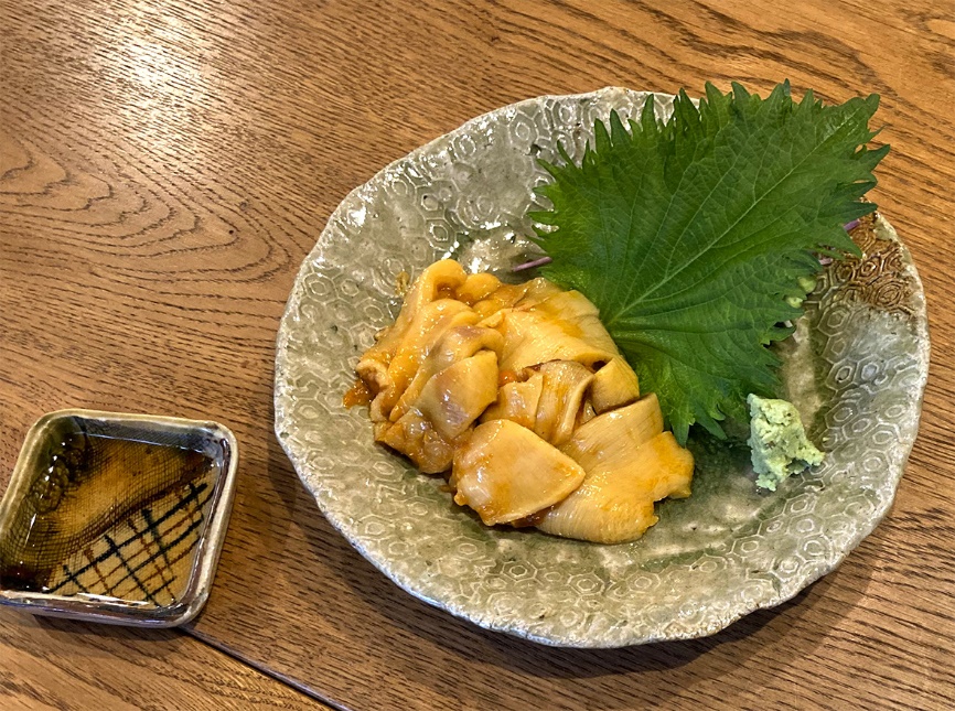 お突き出しにて、ひっつみ、けんちん、せんべい汁。春には岩手の山菜に三陸産の海藻類、初夏から秋まではホヤ、秋には野山の恵みたるキノコ等、冬には三陸産の牡蠣を提供しております。