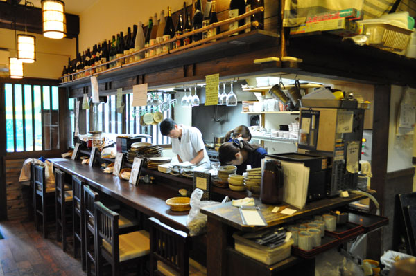 1階には厨房に面したカウンター席、二人掛けのテーブルが2卓、2階にはテーブル2卓と、奥に畳敷きの小上りがあり、掘りごたつ式の六人掛けのテーブルが2卓ある。