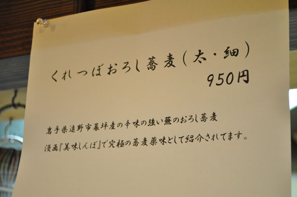 「くれつぼおろし蕎麦」は器に盛られて供される。好みでぶっかけにしても良いという心遣いだ。やや粗めのおろしから刺激的な香気が漂う。蕎麦に乗せ口に含むと、暮坪かぶの深い辛みと何とも言えないさわやかな香気が鼻に抜けるとともに、こしが強く噛みごたえのある蕎麦の香りが口いっぱいに広がる。蕎麦の旨みをより一層ひきたてている。