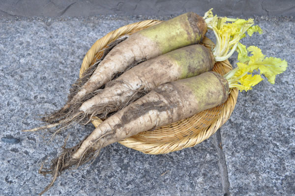 ちょうど新そばと同じ時期に旬を迎える暮坪かぶは、形は小ぶりな大根のようだが、れっきとした「かぶ」で、皮のまま擦り下ろすと、辛みは大根のおよそ14倍、しかも大根のような水っぽさはない。
