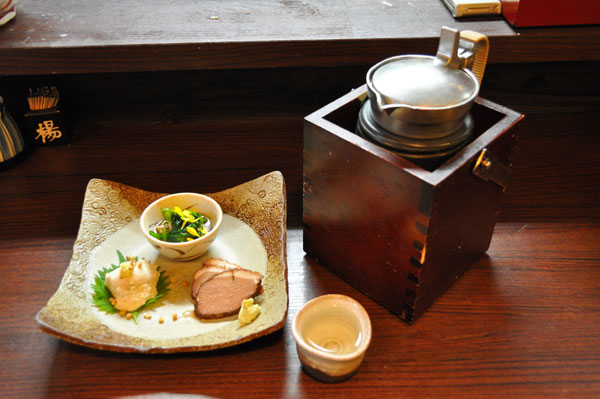 駿河湾産生しらすやしめ鯖など酒好きを刺激する酒肴も豊富だ。燗酒は温度を測り、冷めないように湯を張った陶器に入れて供される。「白海老のかき揚げ」で「月の輪」をいただいたが、至福のひとときだった。
